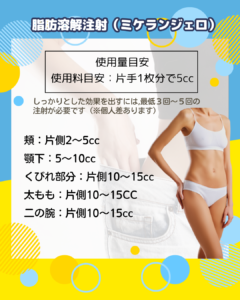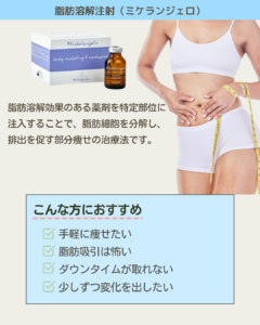 脂肪溶解注射は、気になる部位の皮下脂肪に薬剤を直接注入し、脂肪細胞を破壊・分解させて体外へ排出を促す治療法です。