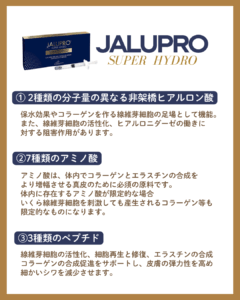 ジャルプロスーパーハイドロは、非架橋ヒアルロン酸に加え、7種類のアミノ酸3種類のペプチドを配合した注入製剤です💉