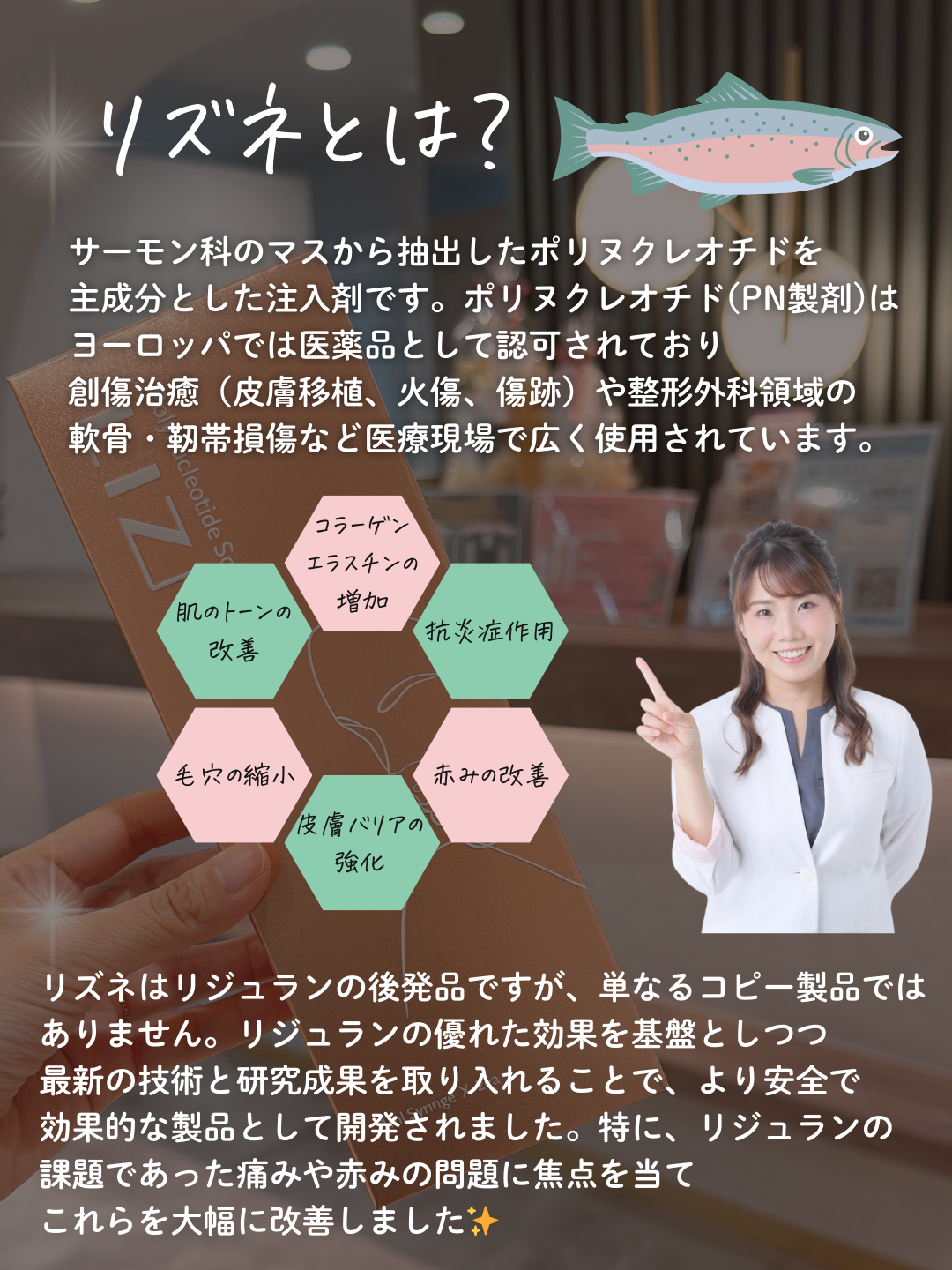 リズネは、サーモンのDNA(PN:ポリヌクレオチド)を主成分とした注入剤です。