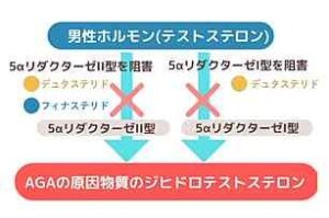 これより生成されたジヒドロテストステロンは毛母細胞の分裂を抑制しAGAを引き起こします。