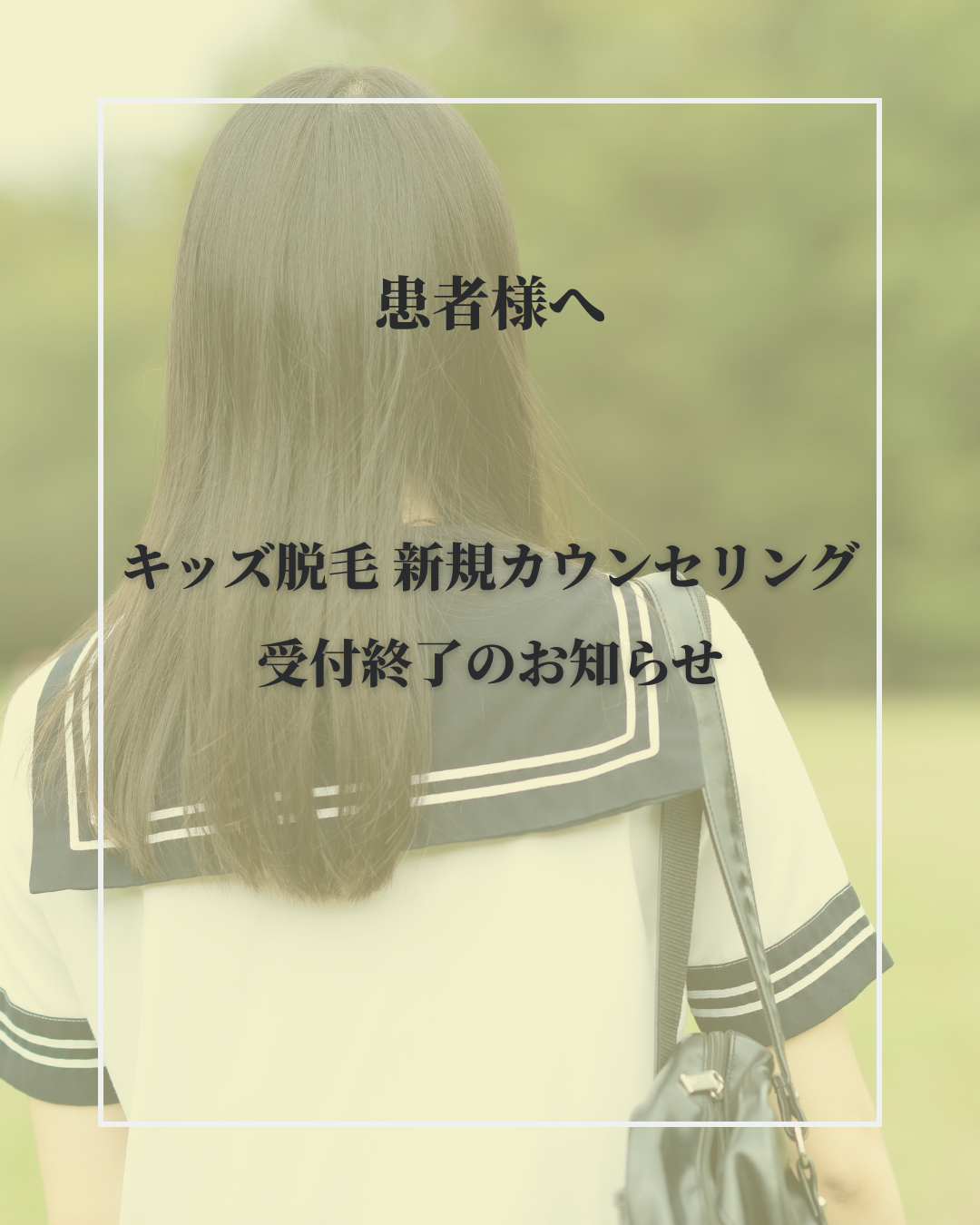 なお、すでに当院で小児脱毛の同意書をご記入済みの方、または現在通院中の方につきましては、これまで通り継続のご予約および追加購入が可能です。